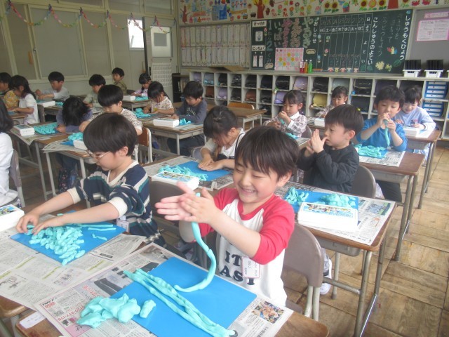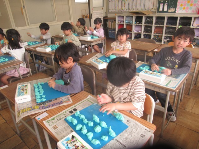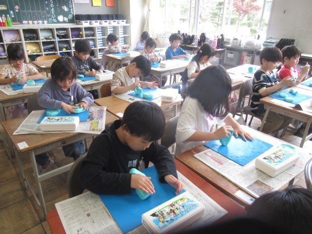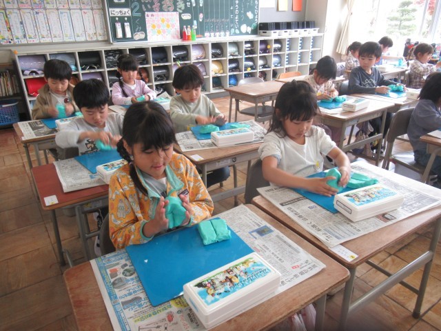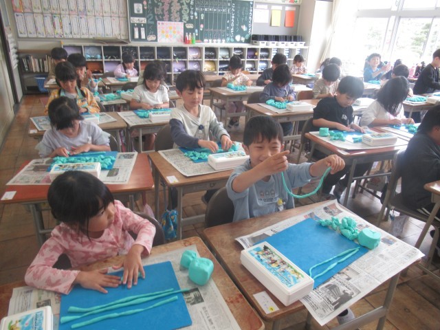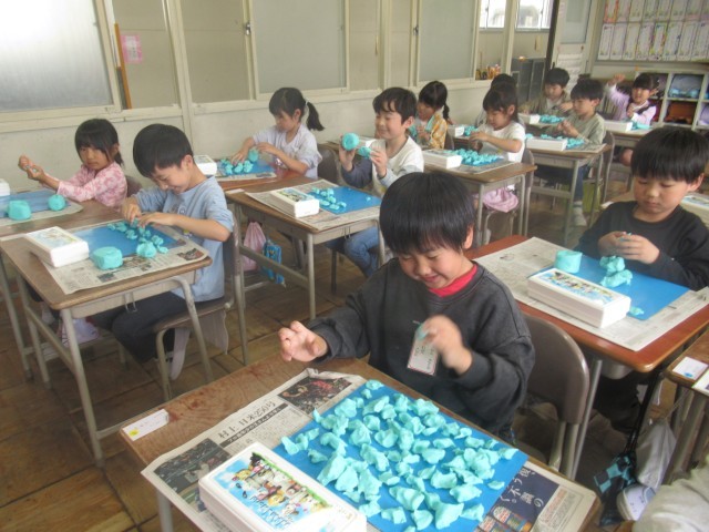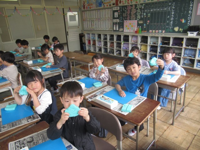 今日の図工の授業は、「ねんどたいそう」をしました。粘土をたたいて、おにぎりの形にしたり、にぎって、ぎょうざの形にしたり、楽しそうに取り組んでいました。