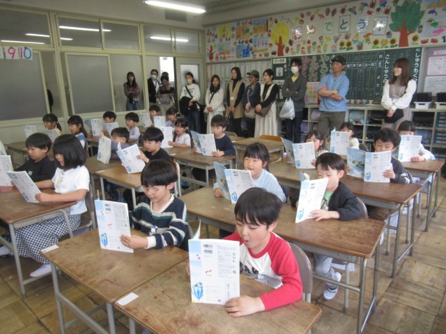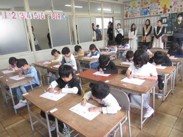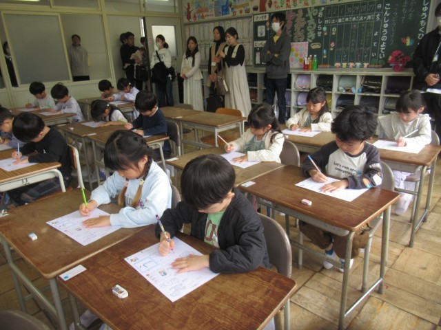 小学生になって初めての授業公開でした。子どもたちは、お家の人に見てもらえるのがうれしくて、張り切っていました。音読をしたり、ひらがなを書いたりする様子を見ていただきましたが、ご家庭でも、音読やひらがなの練習を頑張るよう励ましてあげてください。