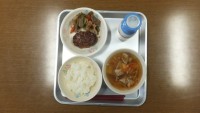今日の献立は、ご飯、牛乳、豚汁、白身魚の黒酢だれです。