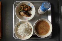 今日の献立は、わかめご飯、牛乳、肉じゃが、ぶり甘みそフライです。
