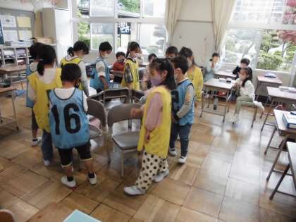 算数の授業では、2チームに分かれて、椅子取りゲームをして楽しみました。6つの椅子にそれぞれのチームが、「いくつ と いくつ」座れるかを通して、数が分解できることを学びました。