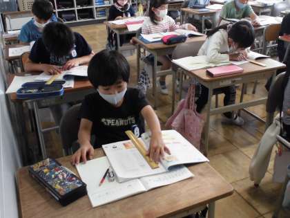 算数では、「長さ」の学習をしています。30cmものさしを使って1cmより短い長さの表し方を学びました。