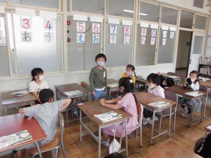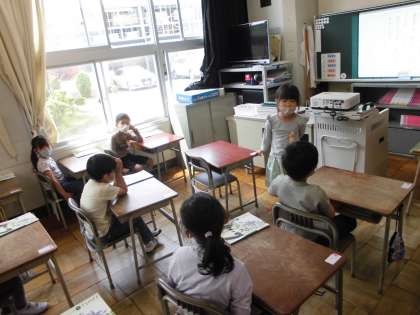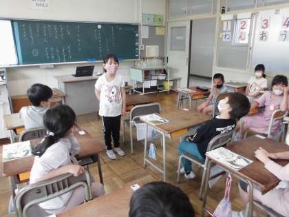 国語の授業で、「ともだちのはなし ききたいな」の学習をしました。友達の好きな遊びを聞いて、クラスのみんなに伝えました。友達の発表を聞くときは、体を発表者の方へ向けることを学びました。
