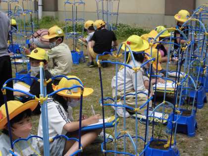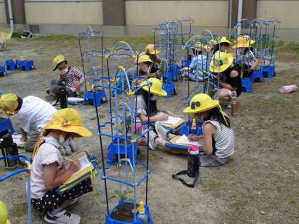 野菜の観察をしました。自分の植木鉢の野菜をよく見て、絵や文をかきました。熱心に取り組んでいました。