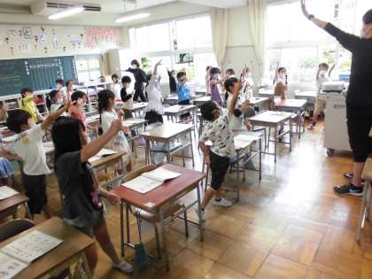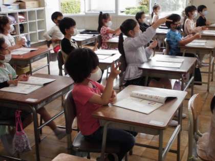 音楽では、「わらべうた」を勉強しました。動作をつけて楽しく授業に参加していました。