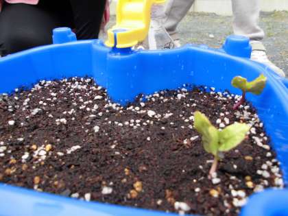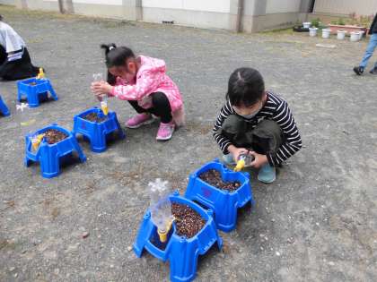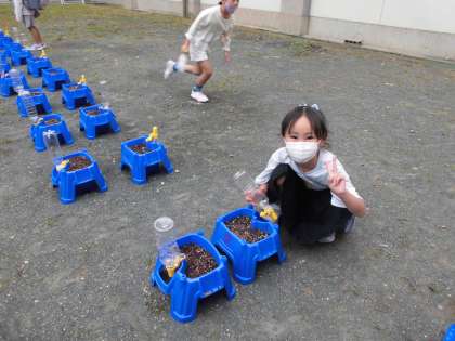 あさがおの水やりをしています。早速、芽が出始めている鉢がありました。「芽が出てた!」と喜んでいる子どもの声が多く聞こえました。