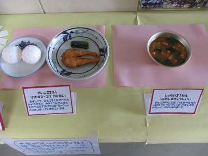 配膳室前に「一宮市の学校給食の歴史」をまとめた掲示物と職員室廊下に「給食のうつりかわり」と題した年代別給食レプリカを展示しました。