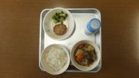 今日の献立は、わかめごはん、牛乳、ミンチカツ、ブロッコリーのおかか和え、えびしんじょうのすまし汁です。