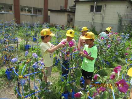みんなが大切に育てた朝顔の花がたくさん咲きました。今日は花を使ってたたきぞめをしてみました。