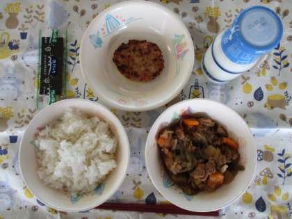 今日は「正しいはしづかいの日」給食で、ご飯、牛乳、肉じゃが、キャベツ入りつくね、味付けのりです。