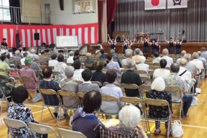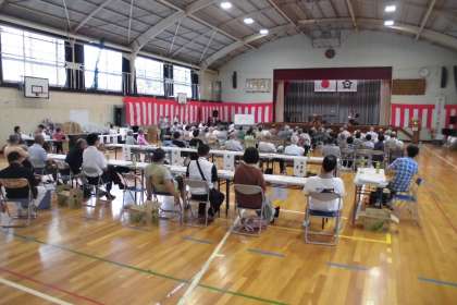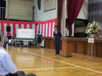 浅野校区の敬老会が屋内運動場で行われました。参加者の皆様、ご長寿おめでとうございます。