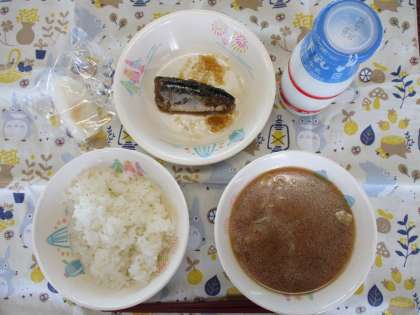 今日は「旬を味わう日」給食で、ご飯、牛乳、さんまのみぞれ煮、秋の味覚汁、なしです。