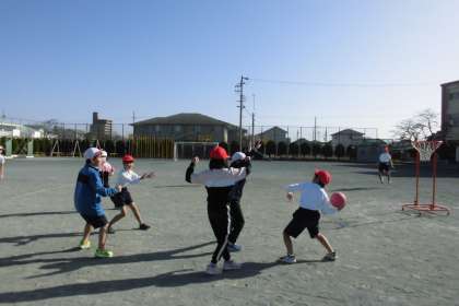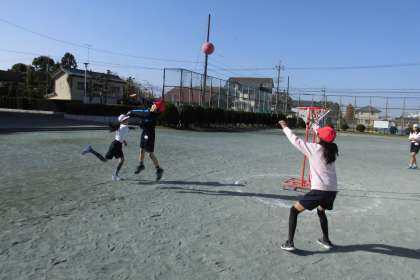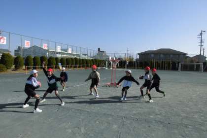 体育の「セストボール」の学習をしています。今日は最後の試合を行いました。友達にパスをつなげ、ゴールまでボールを運びます。声をかけあって、楽しみながらプレイすることができました。
