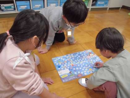 4時間目は1・2年生の3人で仲良くすごろくをしました。ルールを守って仲良く遊ぶことができました。
