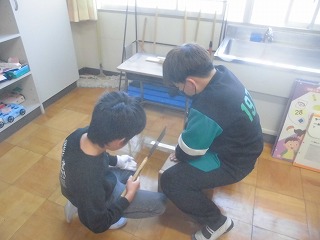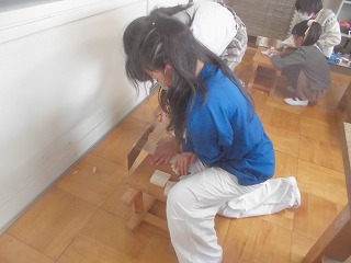 今日から、のこぎりを使って木を切っていきます。ペアの子と協力して、安全に気を付けながらのこぎりを使っています。
