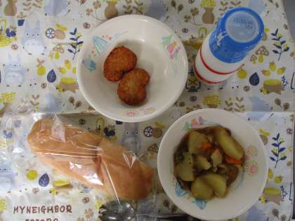 今日の献立は、小麦入り米粉ロールパン、牛乳、大豆入りナゲット、じゃがいものベーコン煮です。
