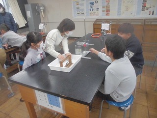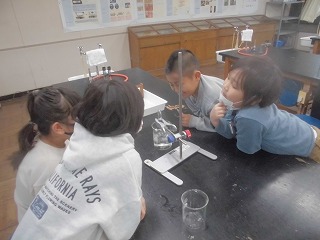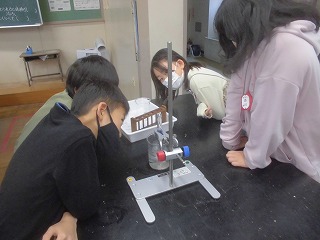 理科で、水をあたためたり冷やしたりしたときに、体積にどのような変化があるのか実験をしました。変化がないか、注目しながら見ています。