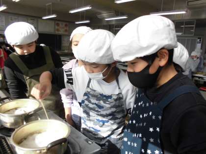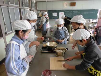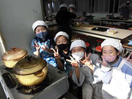 味噌汁は、煮干しで出汁を取りました。出汁の香りの良さを感じながら、みんなで協力しておいしい味噌汁ができました。子どもたちは、「おいしい!」と言いながら、煮干しで出汁を取る良さを感じながら、楽しく食べていました。