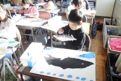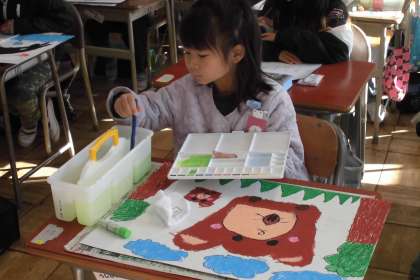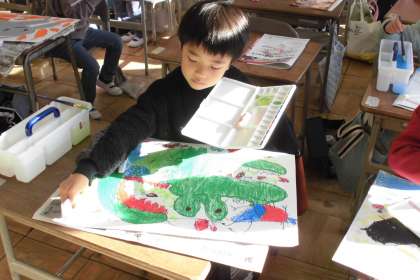 図工では、えのぐを使って色塗りをしました。素敵な作品ができそうです。