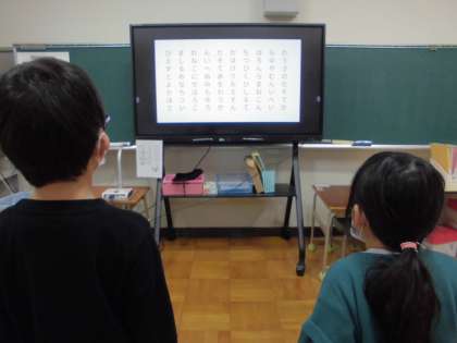 1時間目、たけのこ学級の2年生は見る力を高めるビジョントレーニングに取り組みました。平仮名を下から上に向かって読むことに苦戦しましたが、最後まで頑張って読むことができました。