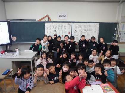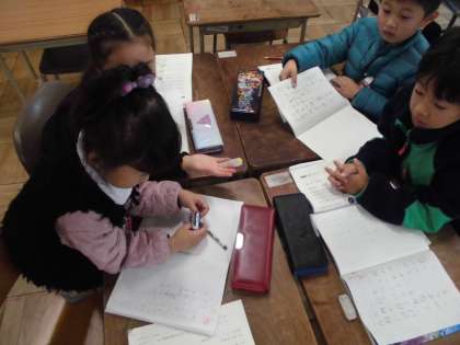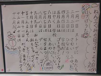 国語の授業では、日づけとよう日の言い方を勉強しています。覚えた日づけやよう日を使って、クラスの日づけ・よう日うたをつくりました。みんなで協力してつくった後、大きな声で楽しく唱えることができました。