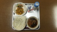 今日の献立は、ご飯、牛乳、とり肉のレモンソースがけ、トマトと卵のコンソメスープ、ココアパウダーです。