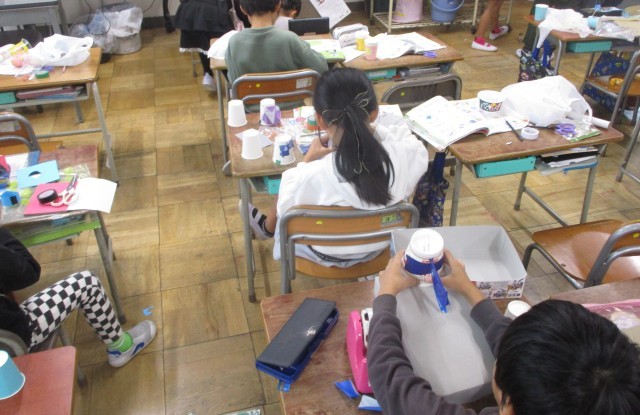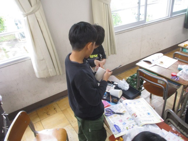 生活科では、動くおもちゃを作っています。ゴムでとぶ「ぴょんコップ」や、風で動く「ヨットカー」などそれぞれどうするとよく動くのか工夫しています。1年生の子も楽しめるようにどんどんパワーアップできるように頑張ります。