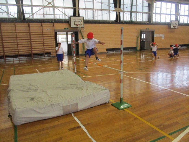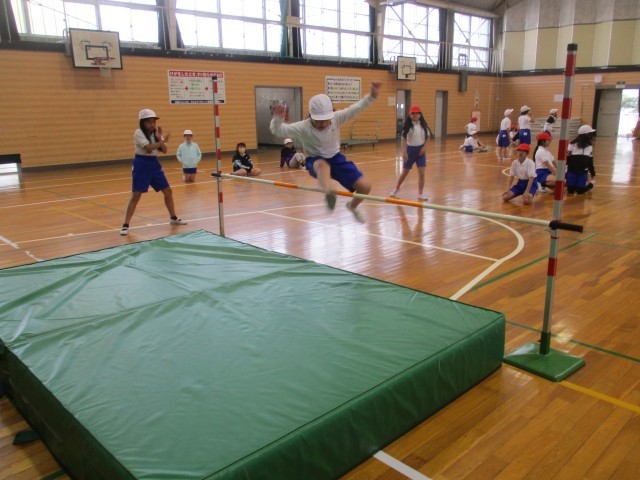 4年生の体育は高跳びをしています。短い助走から踏み切って跳ぶことができていました。