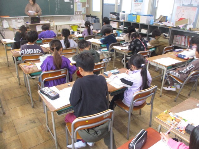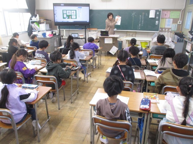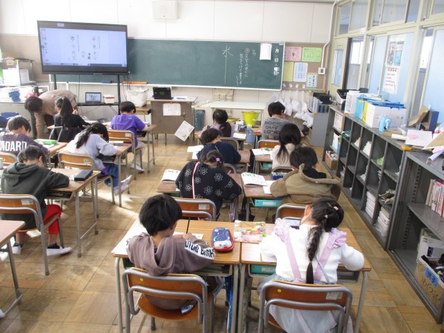 書写の授業で文字の中心に気を付けて書く練習をしました。「水」や「東」、「光」などマスの中心に合わせて書くことができました。よい姿勢でていねいに書くことができました。