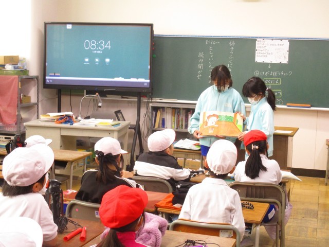 朝、図書委員会さんに本の読み聞かせをしてもらいました。お兄さん、お姉さんに絵本を読んでもらって嬉しそうでした。冬休みももうすぐ始まりますので、読書の時間が増えるといいなと思います。
