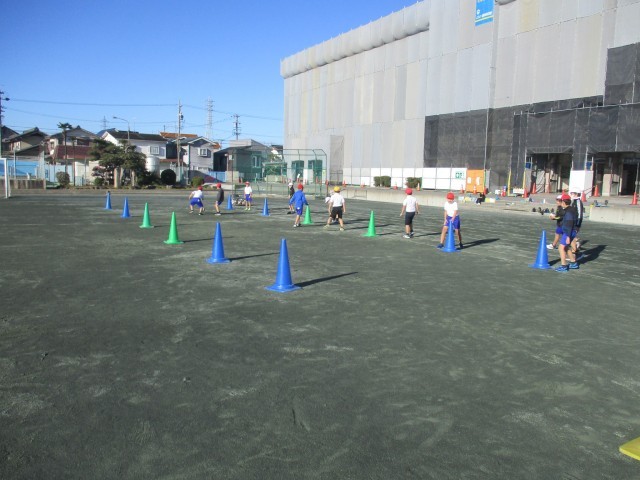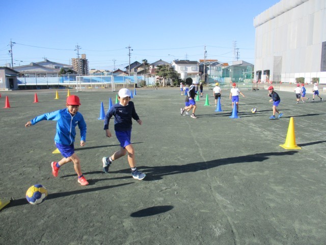 今日の体育の授業ではサッカーをしました。試合に向けて、ドリブルの練習を1対1で行いました。相手にゴールをさせないためにはどうすればよいかを考えながら活動ができました。