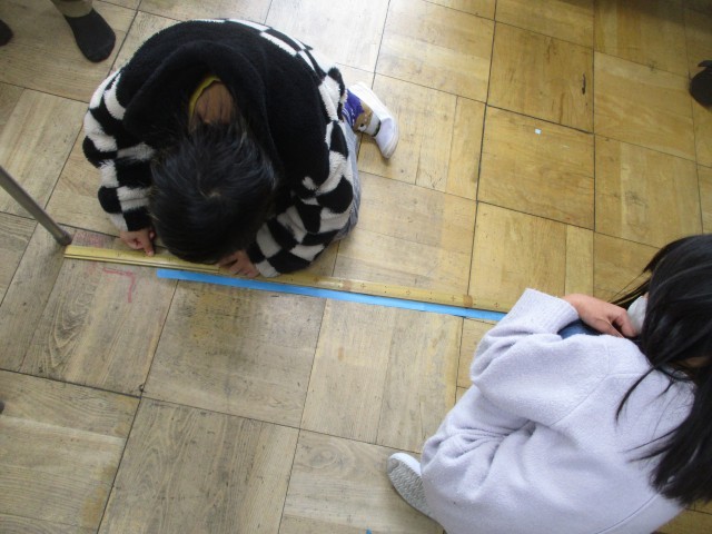 算数の「100cmをこえる長さ」では、1mものさしを使って1mのテープを作りました。グループの友達と協力して作ることができました。