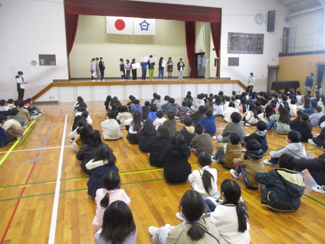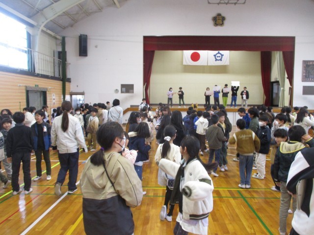 2年生と4年生でペア遊びをしました。背中合わせになり、ペアでポーズをそろえる「以心伝心ゲーム」をしました。ラーメンのポーズをしたり、運動会のポーズをしたりして、4年生と楽しく遊ぶことができました。