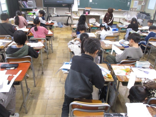 算数の「はこの形」で画用紙を使ってはこを作りました。最初は苦戦していましたが、作り方がわかると立方体は自分たちで上手に作ることができました。辺や頂点の数も調べることができました。