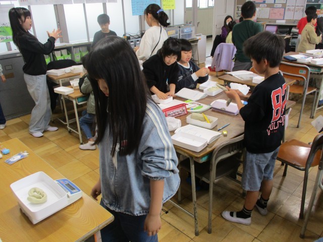 理科の学習では、ものの形をかえると重さは変わるのだろうかと考え、粘土や厚紙を使って実験しました。自分たちの予想をたしかめようと意欲的に実験していました。