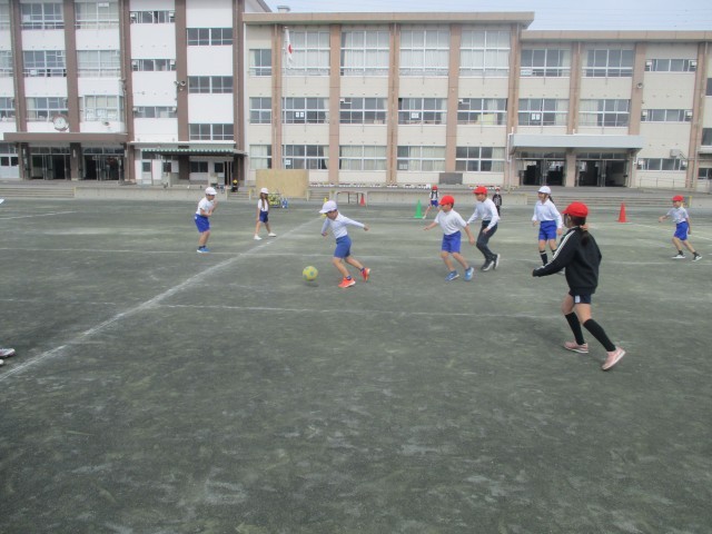 体育のサッカーの学習では、試合をたくさん行い、少しずつ動き方やボール操作に慣れ、白熱した試合をしていました。