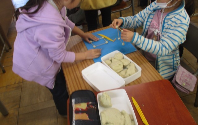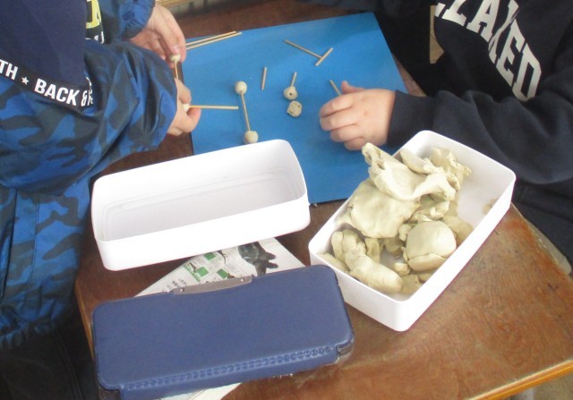 算数の「はこのかたち」で粘土と竹ひごを使って、箱の形を作りました。頂点の数と辺の数を確認しながら、友達と協力して作ることができました。苦戦している子もいましたが、「できた!」と喜んでいる姿が見られてよかったです。楽しんで活動できました。