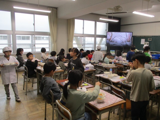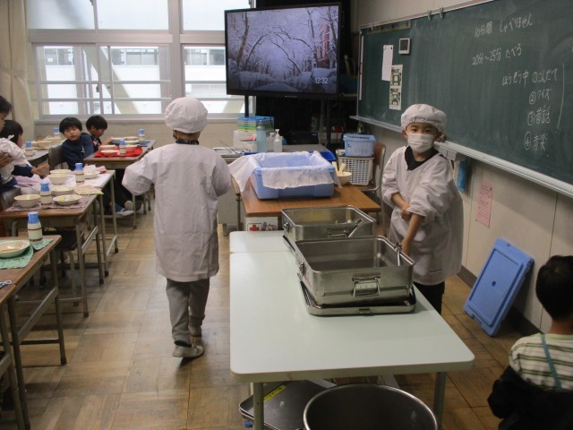 本日より給食が始まりました。当番の人が協力して、静かにすばやく給食を準備することができました。みんなおいしそうに給食を食べていました。