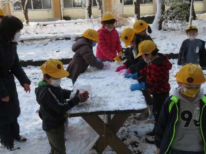 今日は、雪が降ったので、中庭に行き、雪や氷で遊びました。