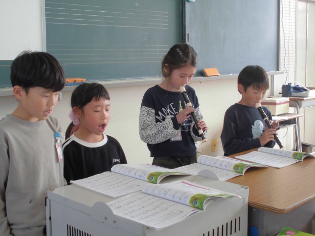 音楽の授業では、「森の子もり歌」という曲を学習しています。今日は練習の成果を発表会としてグループごとに演奏しました。