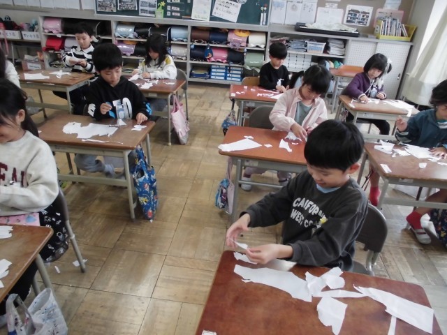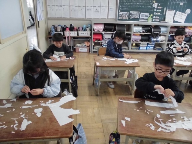 図工で「やぶれたかたちからうまれたよ」を学習しました。どの子もいろいろなかたちをつくって楽しく活動することができました。