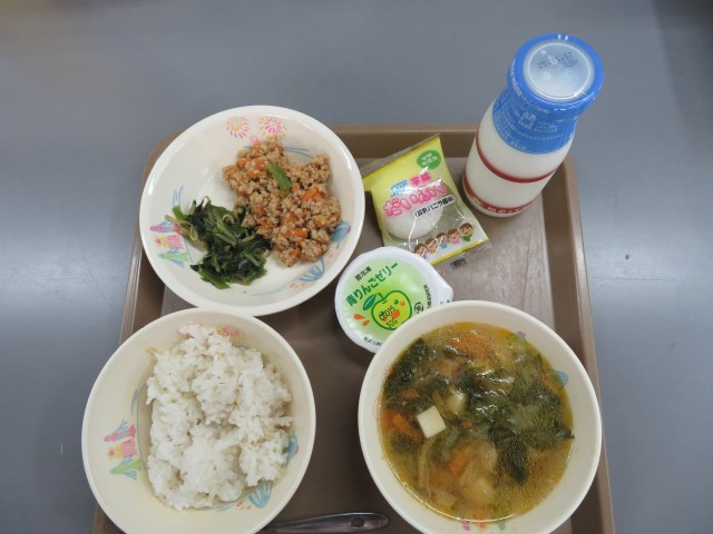 麦ごはん・牛乳・ビビンバの具◎ビビンバの野菜・キムチスープ・セレクトデザート(青りんごゼリーまたは豆乳大福)
