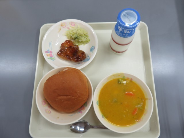 ・サンドイッチバンズパン・牛乳・照り焼きチキンバーガーの具・照り焼きチキン・キャベツソテー・かぼちゃの豆乳シチュー