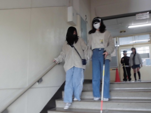 視覚障がい者ガイドヘルプでは、目の不自由な方をどのようにサポートするとよいかを教えていただきました。