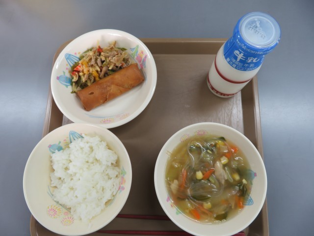 ・ご飯・牛乳・青椒肉絲・春巻き・春雨スープ