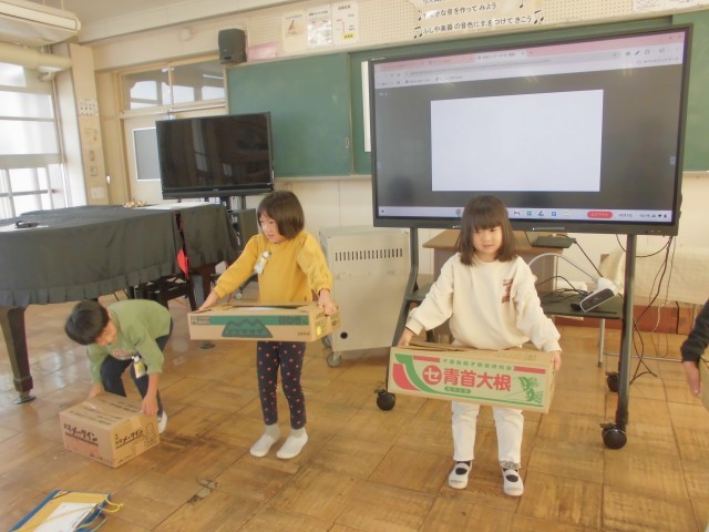 学年で食育の授業を行いました。今日のテーマは「きゅうしょくありがとう」です。給食センターでは大量の食材を、大きな道具を使って調理することをビデオで見て、びっくりしていました。代表者には、使っている道具を持ったり、重い食材を持ち上げたりしてもらったことで、仕事の大変さも感じることができました。最後に給食センターの人に手紙を書きました。「おいしい給食ありがとう」の言葉があふれていました。