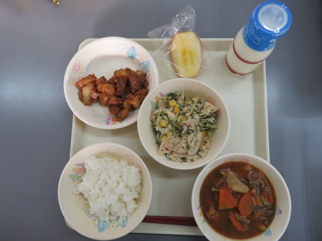 ・ご飯・牛乳・たらとじゃがいものゆずだれがらめ・シャキシャキ和え・冬至のみそ汁・りんご