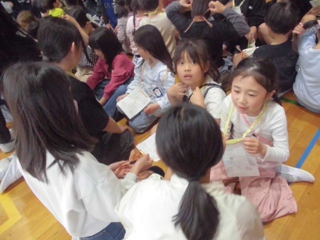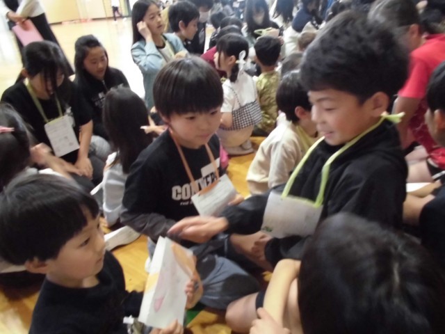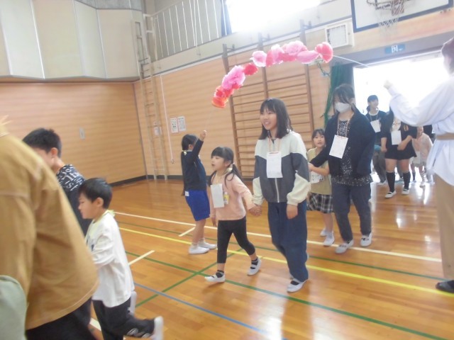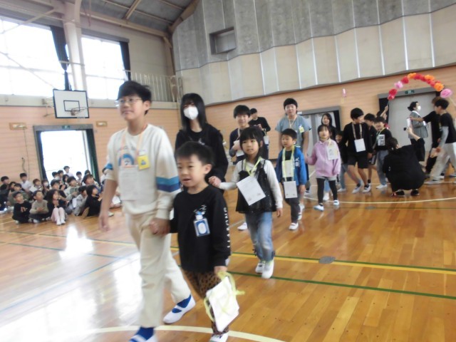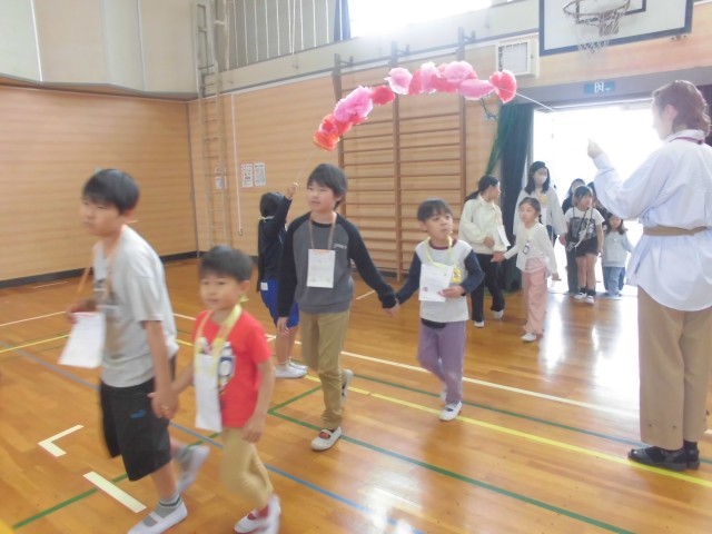 今日は1年生を迎える会・ペア結成式がありました。たくさんのお兄さんお姉さんに迎えられて「どきどきする」と話す子もいましたが、ペアのレクリエーションでは初めて会った6年生のお兄さんお姉さんと楽しく遊ぶことができました。
