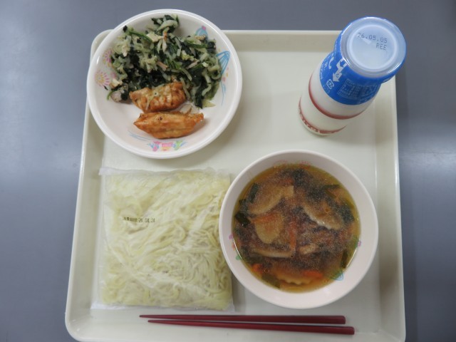 ・中華麺・牛乳・醤油ラーメン(汁)・揚げ餃子・切り干し大根の中華和え