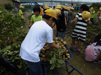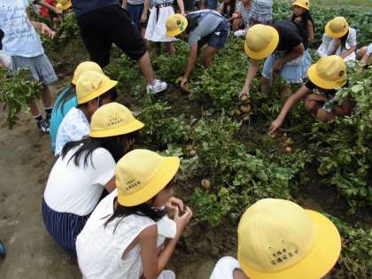 4年生が種いもから育てたジャガイモが育ちました。今日は、そのジャガイモを収穫しました。中には、子どもたちの頭ぐらい大きいものもありました。家に持ち帰り、どうやって食べようか盛り上がっていました。